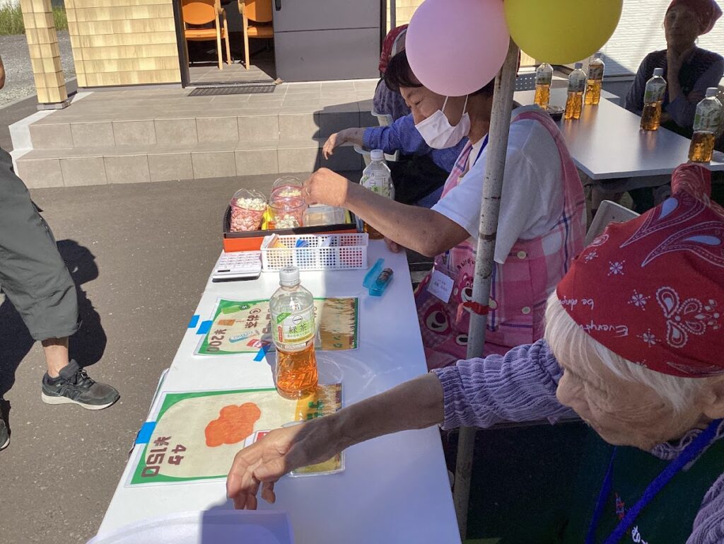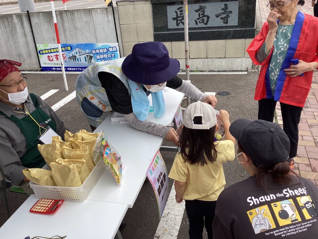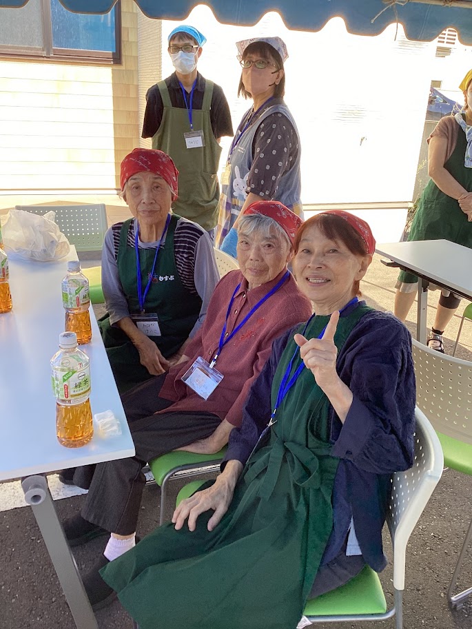 初日は、むすぶと交流があるよりみちカフェからのボランティアさんと、同じ会社で経営するグループホームみやこ東山館と緑が丘館の利用者様と職員がお手伝いにきてくださり、2日目は通所に来られた利用者様と一緒に販売しました。