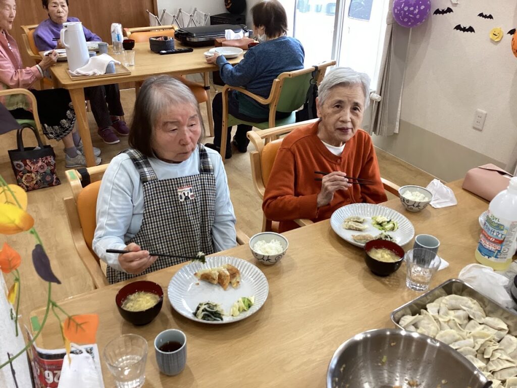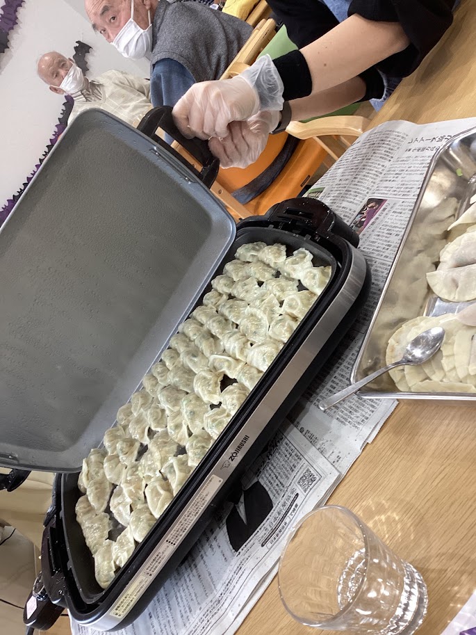 利用者様にも手伝っていただき100個を超える餃子を作成、焼きあがったプレートいっぱいに並ぶ餃子に歓声があがりました。